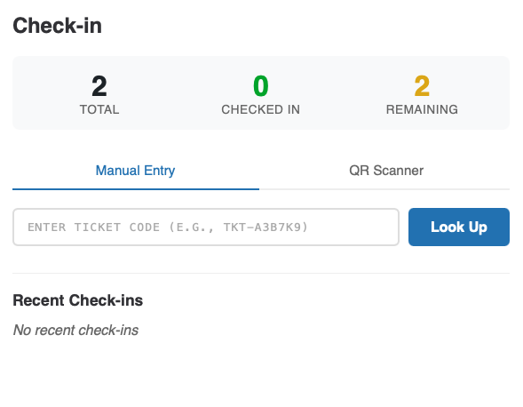 Scan QR codes or search by name to check in attendees. Works on any device with a camera.