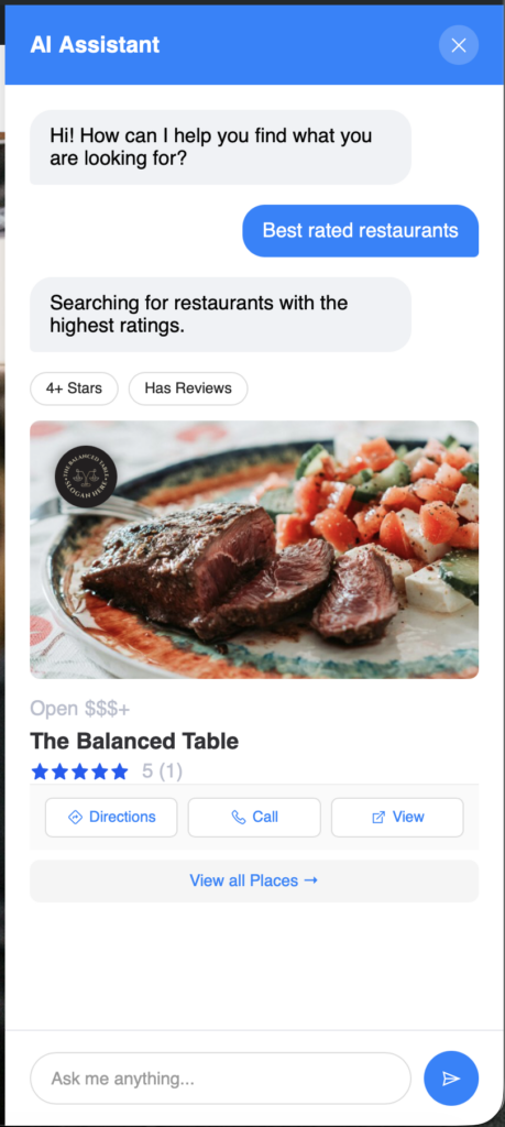 Let your visitors search naturally. Instead of clicking through filters, users can simply ask questions like “Find Italian restaurants near me” or “Events this weekend.” The AI Bot understands context, remembers conversations, and delivers relevant results instantly.