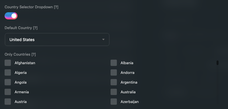 Phone fields now feature country selector dropdowns with flags and dial codes. Set default countries and restrict options per field.
