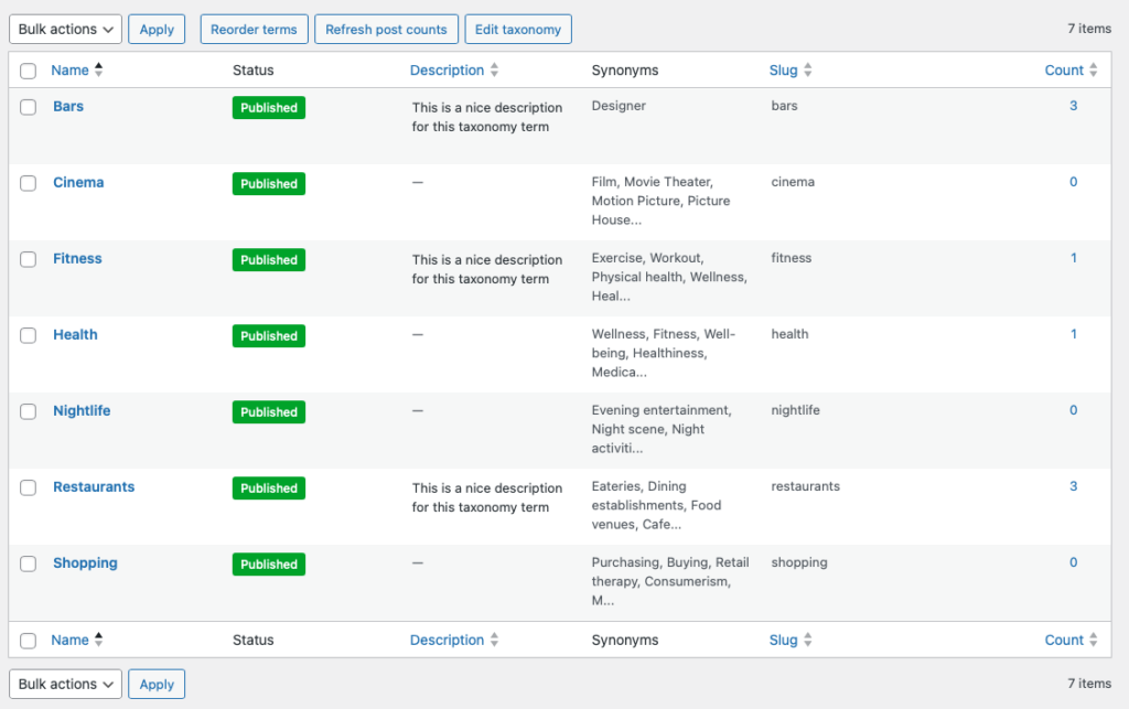 Enhance your keyword search by adding synonyms to taxonomy terms. Users searching for “pub” will find posts in your “Bars” category. AI-powered generation creates relevant synonyms with one click, and bulk generation handles entire taxonomies at once.