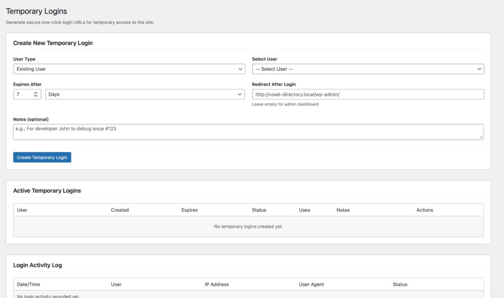 Generate secure one-click login URLs for developers or support staff. No password sharing required. Features include multi-use tokens, configurable expiration, redirect URLs, and full audit logging.